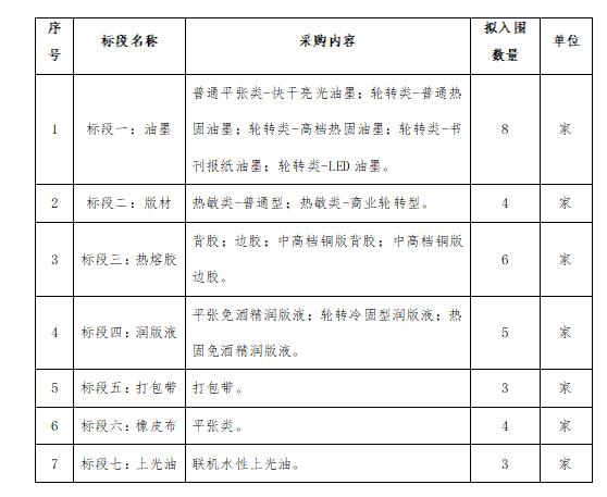 三、征集項(xiàng)目簡介:本項(xiàng)目征集人為中南出版?zhèn)髅郊瘓F(tuán)股份有限公司(以下簡稱“征集人”),湖南省印刷物資有限責(zé)任公司(以下簡稱“采購人”)根據(jù)征集結(jié)果實(shí)施采購,承擔(dān)框架協(xié)議和采購合同的簽訂與執(zhí)行。本次采購范圍為主要印刷輔料,涵蓋油墨、版材、熱熔膠、潤版液、打包帶、橡皮布、上光油七大類,劃分為7個(gè)標(biāo)段。若某標(biāo)段通過資格審查的供應(yīng)商數(shù)量小于擬入圍家數(shù),為保證項(xiàng)目競爭性,推薦入圍供應(yīng)商數(shù)量縮減為N-1,其中N是指通過資格符合性審查的供應(yīng)商的數(shù)量,征集人也有權(quán)針對(duì)該標(biāo)段重新組織采購。具體標(biāo)段劃分如下:
